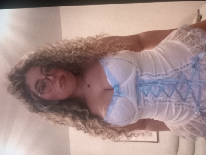 The image displays a female individual, likely an adult, positioned indoors and facing the camera. She possesses long, voluminous, light brown, tightly curled hair with lighter blonde highlights. She wears eyeglasses with reddish-brown frames and has a slight pout on her lips. A small, dark pendant on a thin chain is visible around her neck. She is attired in a white lingerie garment, resembling a babydoll or chemise. This garment features blue lace trim along the top edge of the bust and blue ribbon lacing down the center front, with small blue bows on the shoulder straps and incorporated into the lacing. The lower portion of the garment has a ruffled hem edged with white lace. The background consists of a plain, light-colored wall. A section of light-toned furniture, consistent with a sofa or armchair, is partially visible on the left, along with a partially obscured framed object hanging on the wall. The specific location within the city of Zango-ndaji, Nigeria, cannot be determined from the visual evidence provided in the image.