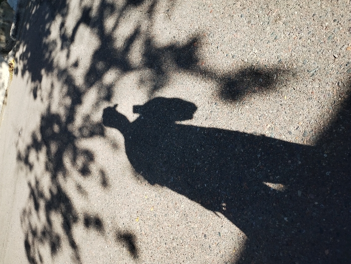 The image captures a ground-level view of a textured grey asphalt surface, sharply illuminated by direct sunlight. A large, dark human shadow is cast across the lower and central areas, depicting an individual wearing a cap. The shadow's right hand holds a rectangular object consistent with a smartphone, suggesting the person is taking a photograph. Multiple smaller, intricate shadows, indicative of tree foliage, are scattered across the asphalt in the midground and background. A lighter-toned concrete curb or raised edge is partially visible in the upper right. The scene is an outdoor paved area, consistent with a street or path in Godoy Cruz, Argentina. The specific street or address within Godoy Cruz cannot be identified from the visual details provided.