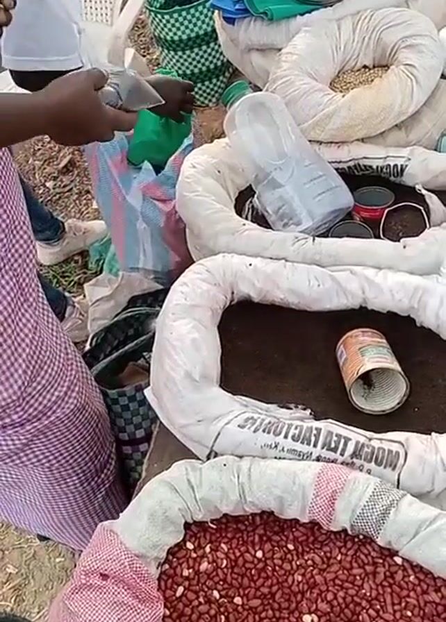 An overhead shot shows a person in a purple and white checkered shirt tying a small green sack next to a variety of objects, including several large sacks filled with peanuts and other goods. One sack is filled with red peanuts, with a metal measuring cup inside. Another sack has a white exterior and is filled with a beige product. Other objects include a clear plastic bottle, a few small metal containers, a green and black checkered basket, and a can lying on its side. Part of a white plastic chair is visible in the background. A second person can be seen in the background wearing jeans and white shoes.