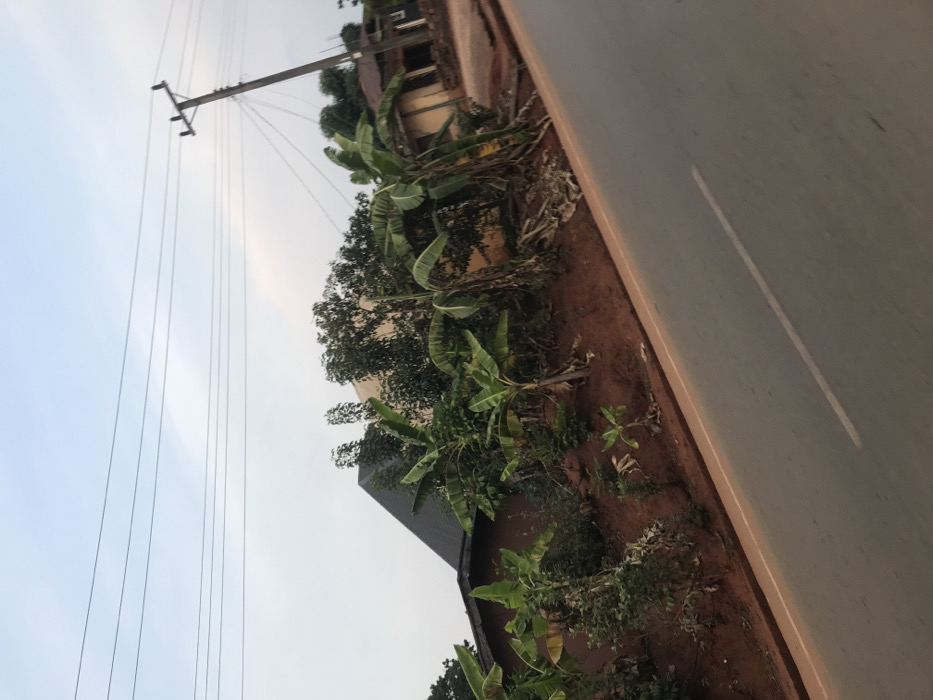 The image depicts an outdoor scene in an unknown city, showing a paved road flanked by a vegetated embankment and buildings under an overcast or hazy sky. The road, running diagonally from the lower left to the upper right, is grey asphalt with a single solid white center line visible in the lower right quadrant. A narrow reddish-brown dirt shoulder separates the road from an elevated bank of reddish-brown soil on the left. This embankment is densely covered with vegetation, prominently featuring numerous banana plants in various stages of growth, alongside other green foliage and trees. In the mid-ground, behind the vegetation, several structures are visible. On the far left, a building with a dark, sloped roof is partially obscured. Towards the center-right, a lighter-colored building with a visible roof peak is present behind trees. Further to the right, another building with light-brown walls and a darker roof appears, possibly in a state of construction or disrepair. A wooden utility pole with multiple cross-arms and power lines stands on the far right side, extending into the sky. Multiple dark power lines traverse the upper portion of the frame horizontally. No people, animals, vehicles, or specific actions are observed. The lighting is diffuse, with no harsh shadows.