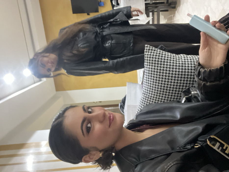 Two women are captured in a selfie-style shot. One woman is closer to the camera, seated with a black leather jacket. She has dark hair, fair skin, and a subtle smile. Behind her is another woman, who stands in the background wearing a similar black leather outfit, with brown, shoulder-length hair. A decorative pillow with a black and white pattern is partially visible. The lighting appears to be indoor, with a warm, artificial glow.