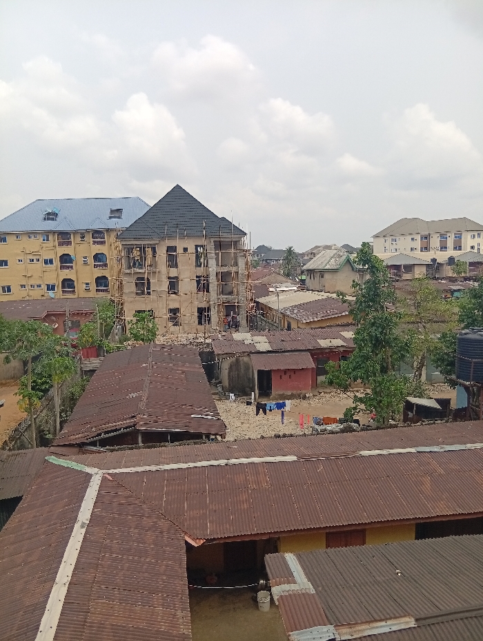 This is an elevated, wide-angle view of a densely populated urban area in Aba, Nigeria, under an overcast sky. The scene is dominated by a mix of residential and construction structures. In the foreground, multiple weathered corrugated metal roofs, predominantly rust-colored, cover single-story buildings. These roofs show varying degrees of degradation and discoloration. The mid-ground features a four-story building currently under construction, centrally located. It has unpainted concrete or plaster walls and is enveloped by extensive wooden scaffolding. A dark, peaked roof, possibly made of shingles or dark metal, caps the structure. To its left, a completed multi-story building with a light yellow facade and a blue corrugated metal roof stands, exhibiting multiple windows and balconies. Surrounding the central construction site are several smaller, single-story structures with various roof types. One red-walled building is visible, fronting an unpaved courtyard where laundry hangs on a clothesline. Green trees and shrubs are scattered throughout this section. The background shows additional multi-story buildings, including one light-colored, finished structure with a flat roof, blending into the distant urban skyline. A black plastic water tank is visible on a platform to the far right. No individuals are clearly discernible engaging in specific actions or interactions within the frame. The overall environment suggests ongoing development and established residential areas.