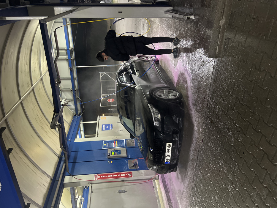 The image captures a nighttime scene within a self-service car wash bay in Ruse, Bulgaria