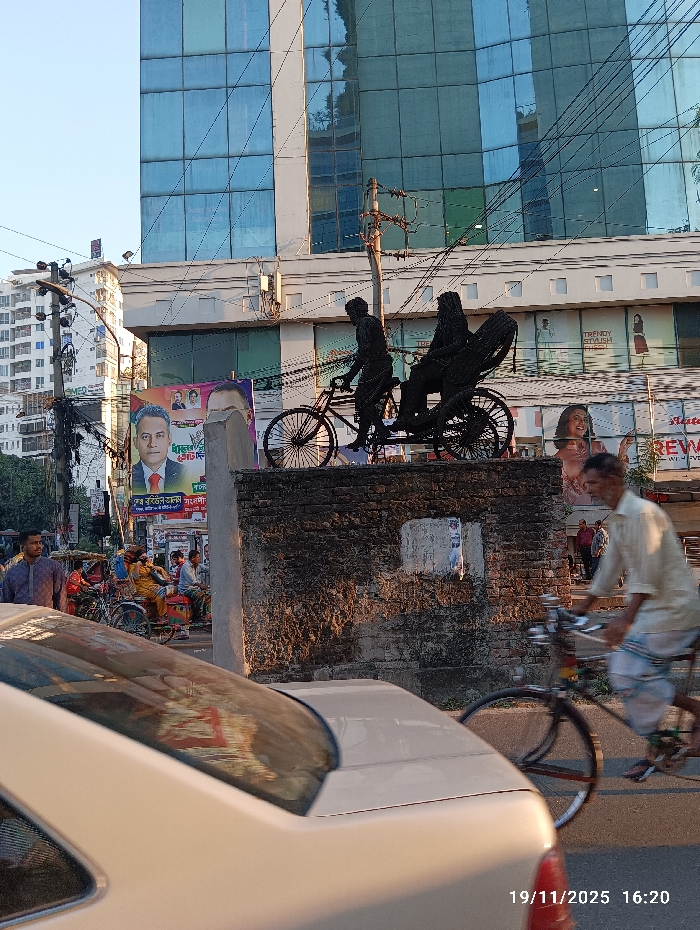 The image depicts a street scene in Dhaka, Bangladesh, captured on November 19, 2025, at 16:20. In the immediate foreground, the rear section of a light-colored sedan is visible, positioned on the lower right and obscuring the street below. A man riding a bicycle, wearing a light shirt and patterned lungi, is partially visible cycling past the car from right to left, his motion blurred. Centrally located in the midground, a dark-colored, two-dimensional sculpture of a cycle-rickshaw, featuring a driver and a passenger, is mounted atop a weathered brick wall. The wall itself is covered with faded posters and advertisements. Behind the wall, to the left, a large billboard displays the portrait of a man, likely a political figure, alongside text in Bengali. Further left, a utility pole densely wired with overhead lines stands amidst other buildings. Several individuals are present in the midground, including a man in a patterned blue shirt standing on the left and others gathered near parked cycle-rickshaws. The background is dominated by a tall, modern building with a blue-tinted glass facade reflecting the sky and surrounding structures. To its left, another multi-story building with numerous windows is visible. The sky above is clear and light blue, indicating daylight conditions.