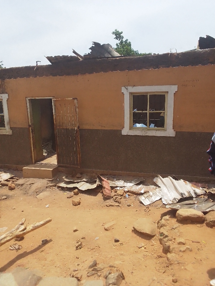 damaged building located at coordinates 9.804, 8.646 in Kwal, Nigeria. The building is made of brick and is painted a light orange color. The roof is partially destroyed with pieces of corrugated metal lying on the ground around the building. There is a window on the right side of the building that is also broken and a closed door on the left side of the building. The door is made of metal and has a barred opening. There are also a few rocks and pieces of wood scattered around the building. The ground is dirt and there is a small amount of vegetation in the background. There are no people present.