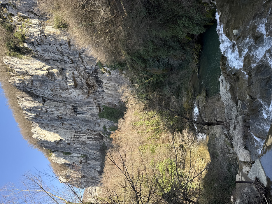 The image depicts a natural landscape in Lesicharka, Bulgaria. A massive, vertical limestone cliff, characterized by grey and white rock formations, fissures, and dark mineral staining, dominates the upper two-thirds of the frame beneath a clear blue sky. Patches of green ivy cling to the cliff face. Below the cliff, a dense growth of trees and shrubs, predominantly bare deciduous branches mixed with some evergreen foliage, fills the mid-ground. In the foreground, a river cascades over multiple rock ledges, creating white rapids. The water then collects in a deep, dark turquoise pool before continuing downstream, forming calmer currents and additional smaller pools. A single bare-branched tree stands near the water's edge in the mid-foreground. A dark, thin metal pole is partially visible at the bottom-left, indicative of a boundary or marker. No human subjects or animals are present. The scene is illuminated by sunlight, casting shadows across the terrain.