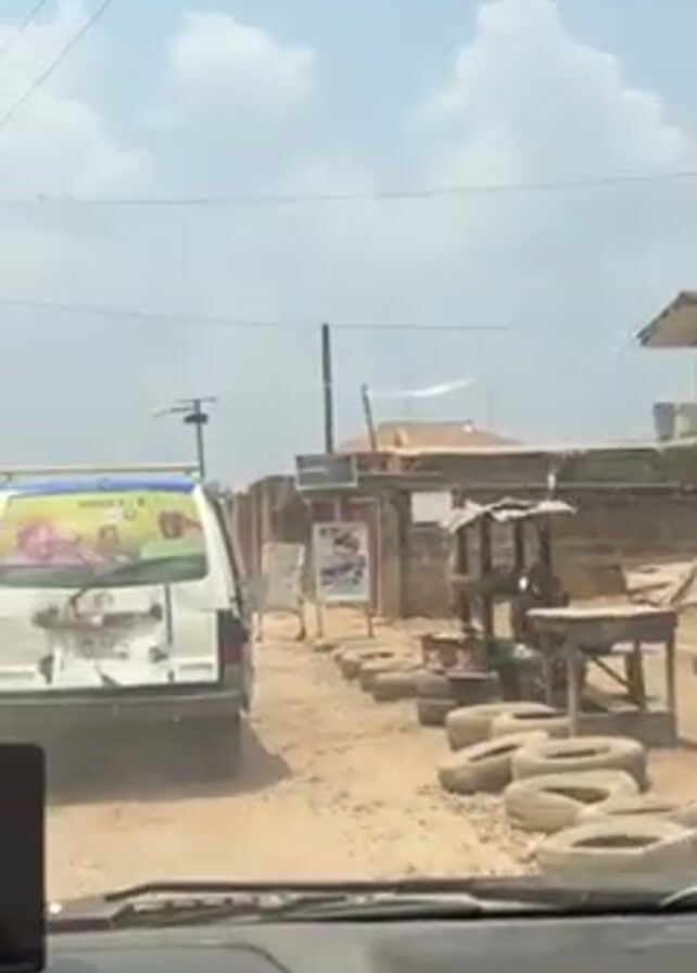 street scene in an African town. The camera is inside a moving vehicle, likely a car, driving down a dusty, unpaved road. On either side of the road are small buildings, some with corrugated iron roofs. There are a few people visible, including some on motorcycles. A white van with a large advertisement on the back drives ahead of the camera car. There are old tires lining the side of the road. The sky is partly cloudy.