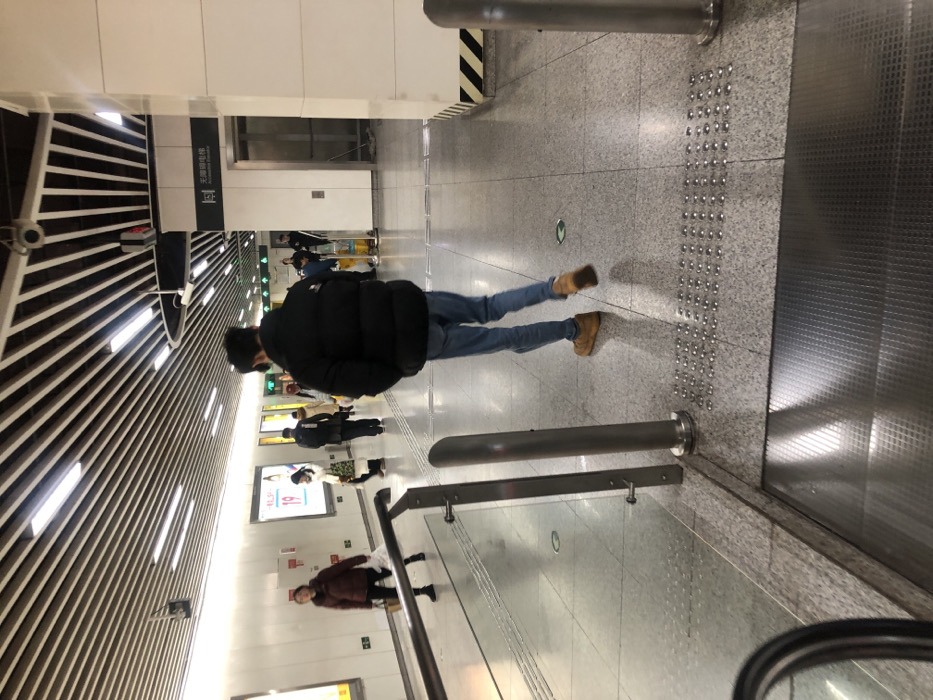 A person in a black jacket and jeans walks on a gray tiled floor with tactile paving. The person is in a subway or train station, with an escalator on the right. Other people are visible further down the hall, including a woman in a red coat. There are posters on the wall. Overhead, the ceiling is lined with white fixtures.