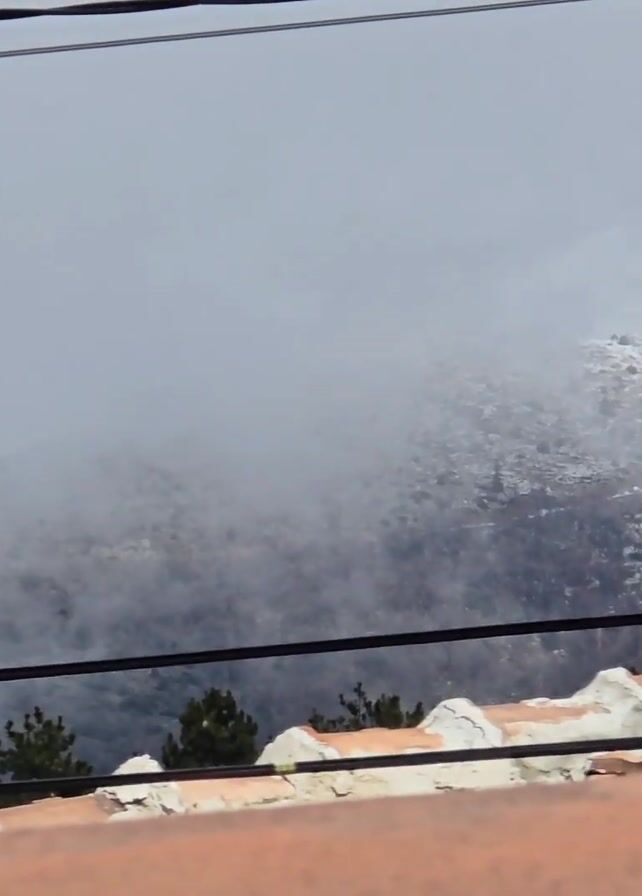 snow-covered mountain obscured by fog, as seen from a vantage point on a rooftop with red terracotta tiles. Two electrical wires run across the top of the frame. A small structure or building is visible on the mountain. The sky is overcast. A chimney is visible in the top right corner of the frame.