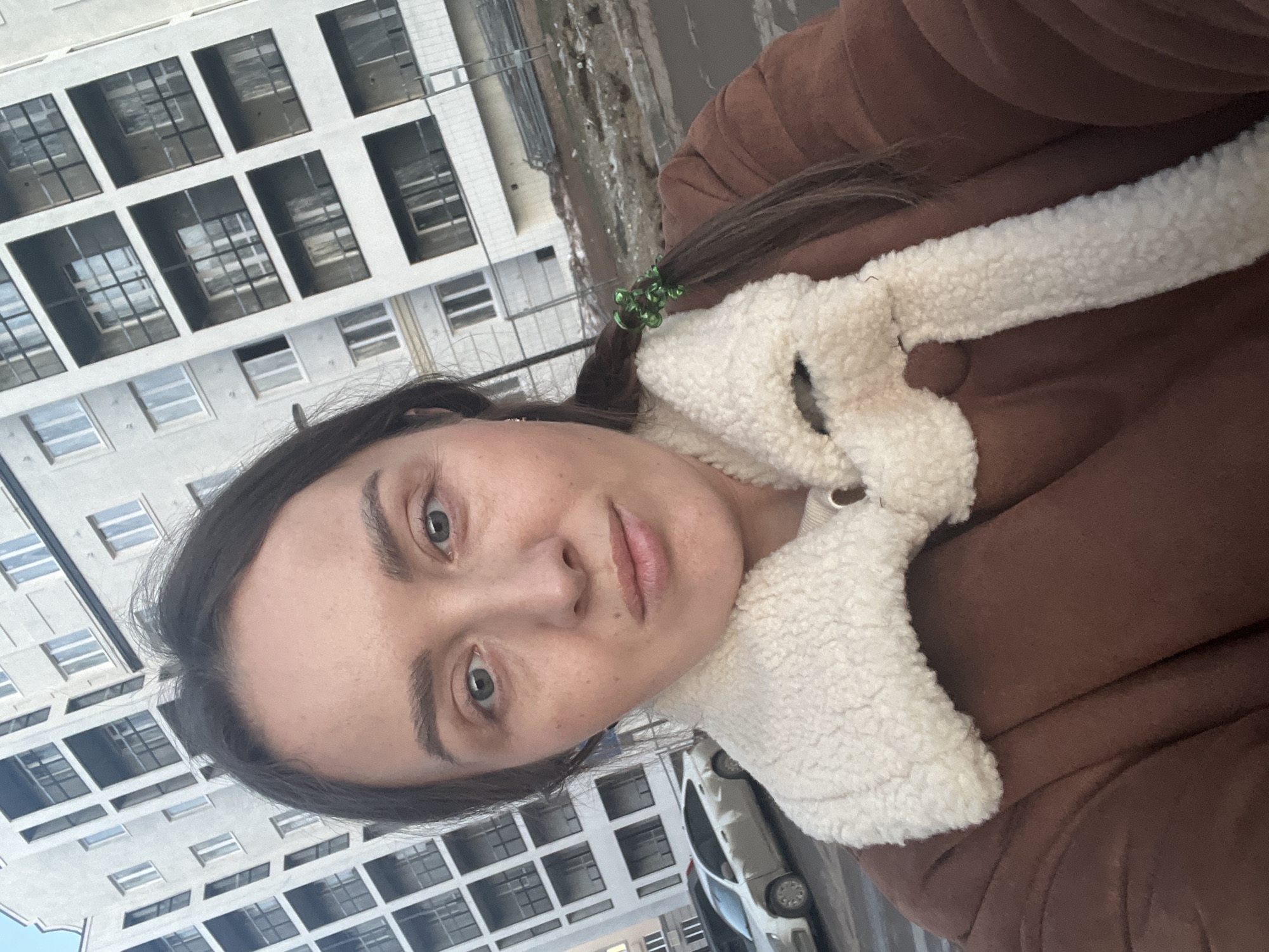 A person is centered in the frame, wearing a brown jacket with a white, sherpa-lined collar. The person's hair is dark and pulled back in a partial ponytail, secured with a green hair tie. The background features a multi-story building with a grid-like window pattern. A section of street with parked cars is visible. The location is likely Chemoshur, Russia, based on the prompt. The time of day appears to be daylight.