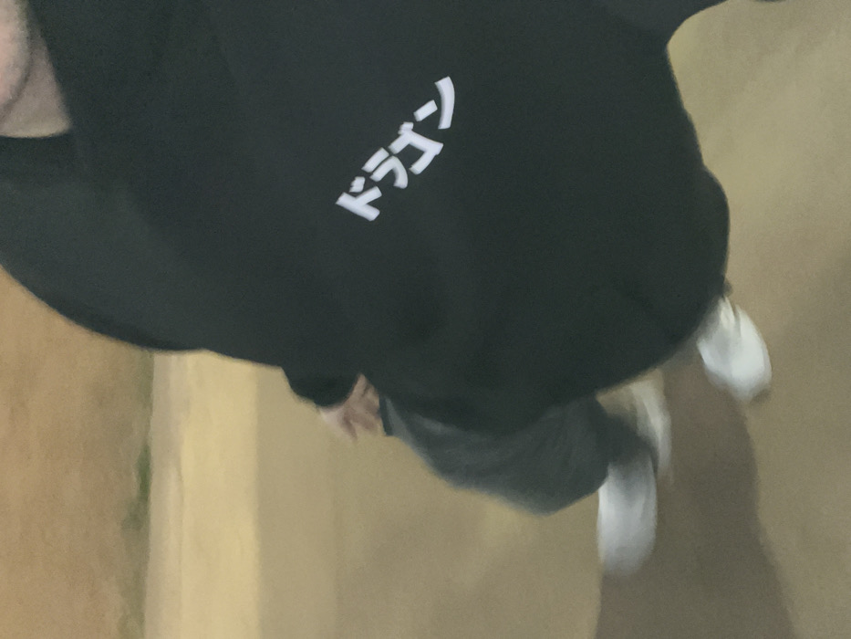 The scene is located in Pazardzhik, Bulgaria. An individual is partially depicted, oriented with their torso and lower body towards the viewer. The subject is wearing a black hooded sweatshirt with white Japanese Katakana characters, 'ドラゴン' (Doragon), printed diagonally on the chest. Dark-colored trousers or jeans are visible, paired with white athletic shoes. Significant motion blur is present, particularly around the lower extremities and the edges of the subject, suggesting movement. The background consists of an indistinct, uniformly lit, light tan-colored surface, possibly pavement or a wall, with a faint, blurred green area in the upper left, indicative of distant vegetation. No other individuals or specific landmarks are discernable.