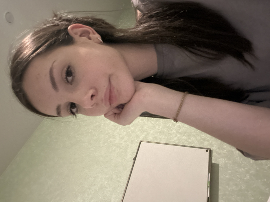 The scene depicts a young female subject photographed indoors in Kudrovo, Russia. The subject, appearing Caucasian, is positioned in the right half of the frame, facing the camera directly. She has long, dark brown hair, fair skin, and dark eyes. Her left hand rests beneath her chin, fingers supporting her jaw. She wears a grey t-shirt and a light brown beaded bracelet on her left wrist. A light-colored stud earring is visible in her right ear. The background consists of a textured, light green wall. To the left, a portion of a white rectangular object, framed in dark material and consistent with a whiteboard or mirror, is visible.