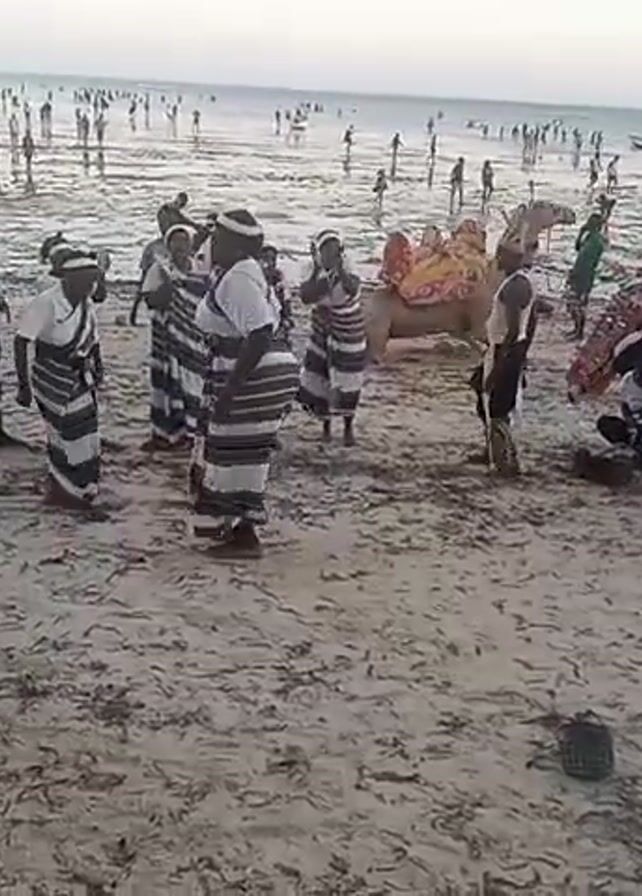 On a sandy beach, a group of people in traditional striped clothing dance to live music. A camel decorated with colorful fabric stands nearby. In the background, many people are in the shallow water of the ocean. A few boats are visible on the horizon.