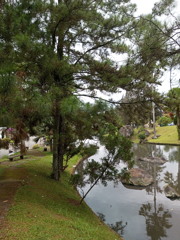 Lush greenery frames a still body of water reflecting sky and trees. A grassy bank leads to the water's edge, punctuated by a leaning tree. Scattered rocks protrude from the water's surface, their forms mirrored below. A distant path and glimpses of buildings suggest a park-like setting under an overcast sky. Benches sit along the path.