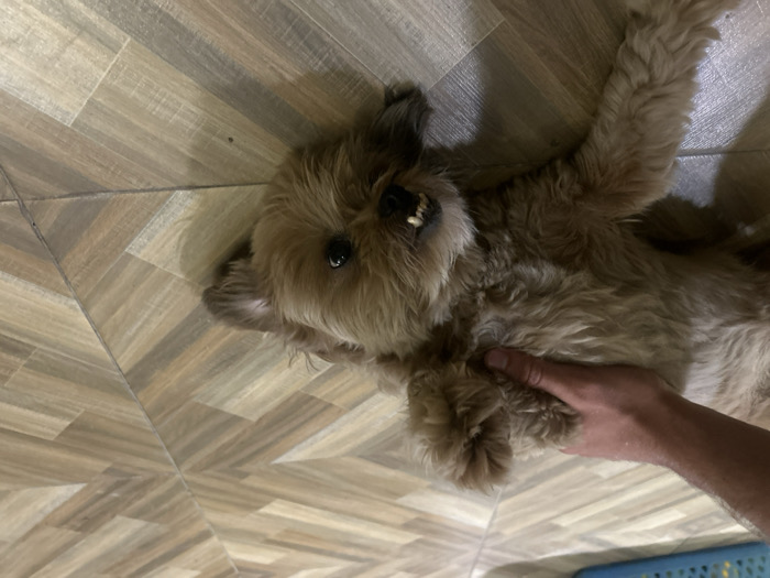 - "A light brown, fluffy dog is positioned on its back on a wood-patterned tiled floor in Pai, Thailand" by FM-NScrU2, licensed under CC BY 4.0