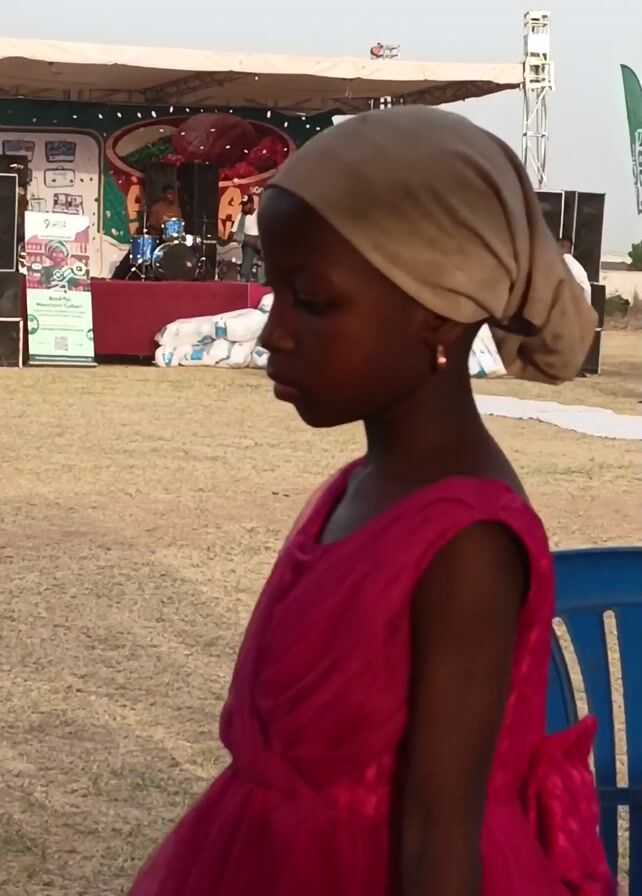 n outdoor event with a stage set up on a grassy field. On the stage, a band is playing, and there are several people standing around. In front of the stage are stacks of large white bags and a white runner. Two people in colorful outfits are dancing on the runner, while a man in a red suit walks nearby. In the foreground, there is a blue plastic chair and the arm of a person wearing a red dress. The camera appears to be held by someone sitting in a chair, as the arm is visible. Other people can be seen standing around the stage. The sky is bright, indicating it is likely daytime.