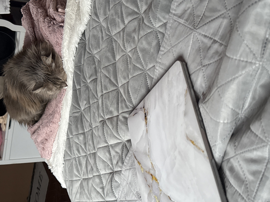 The scene depicts an indoor bedroom setting in Kazanlak, Bulgaria. A long-haired domestic cat, exhibiting grey and brown fur with a visible white nose, is observed sleeping in a curled position on a pink plush blanket. This pink blanket rests on a white fluffy blanket, which is situated on a grey quilted bedspread. The bedspread features a repeating geometric pattern of stitched diamonds. In the lower left foreground, a closed electronic device, resembling a laptop or tablet, with a white marble-patterned cover featuring gold veins, lies diagonally across the grey bedspread. The background includes a partial view of light-colored furniture and a dark mat with the word "HOME" partially discernible.