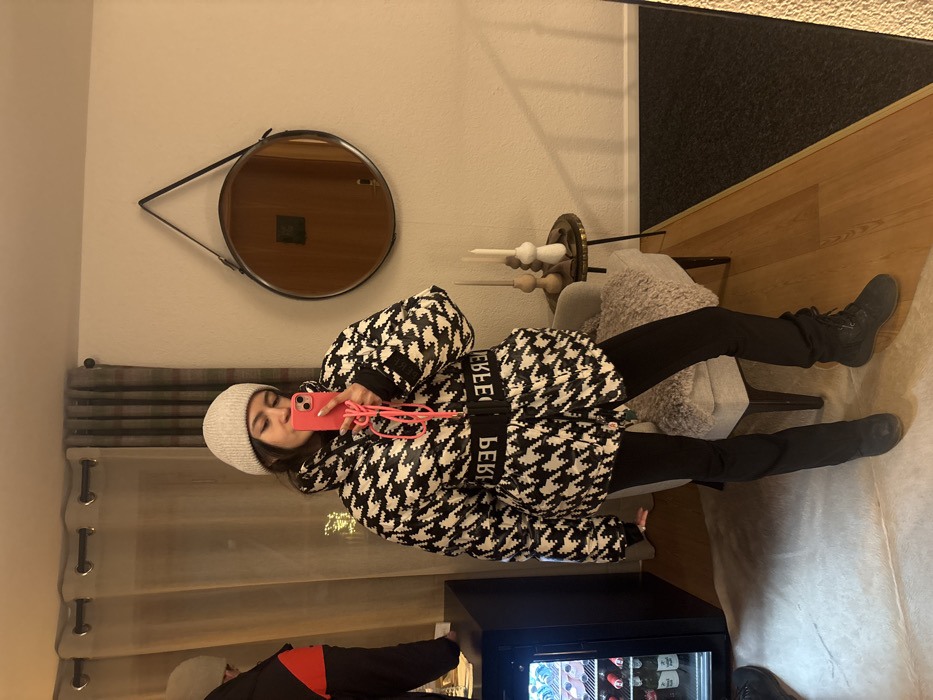 A person wearing a black and white patterned jacket, black pants, boots, and a beanie takes a selfie with a pink phone. Behind the person, there's a mirror, a chair with a fuzzy cushion, and a candle display on a small table. Curtains are visible on the left. A mini fridge displaying various bottles and cans is in the foreground. There is another person in the reflection.