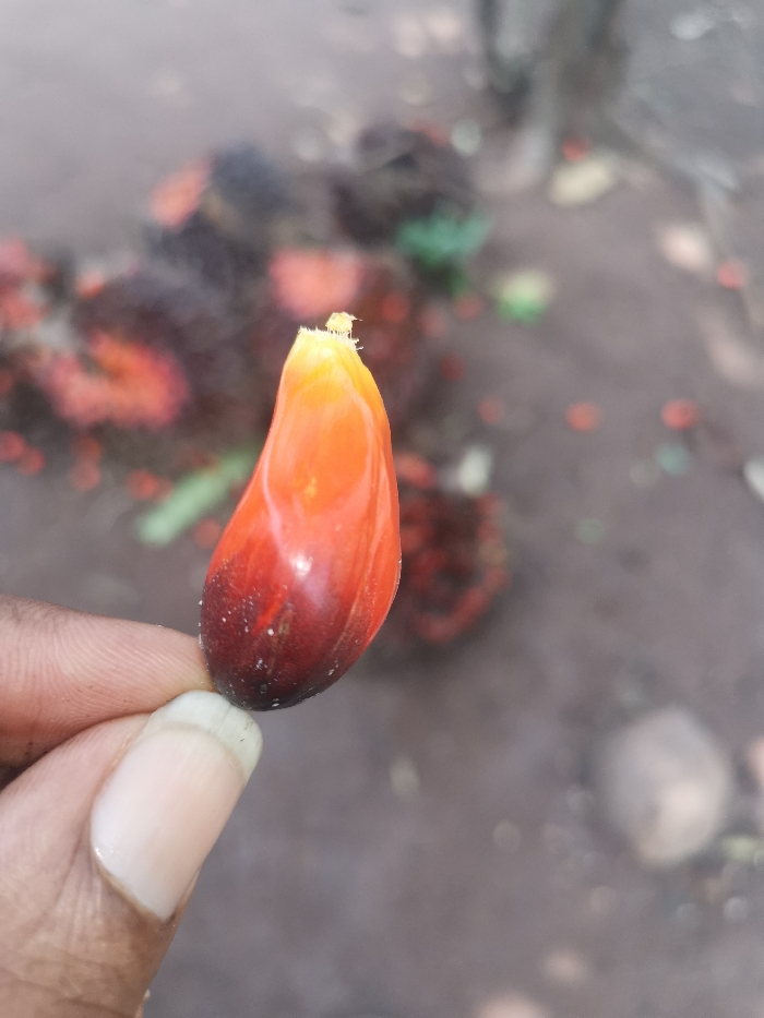- "In the city of Otolokpo, Nigeria, a human left hand is depicted holding a single palm oil fruit (Elaeis guineensis)" by FM-t8Vzk1, licensed under CC BY 4.0