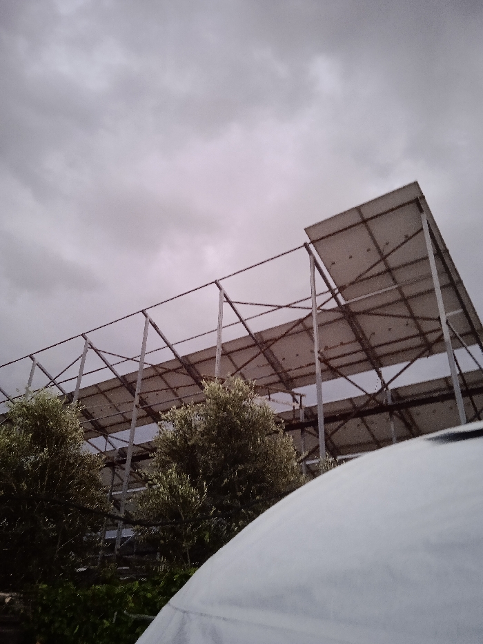 A low-angle shot shows a large, elevated metal structure with panels angled upwards against a cloudy sky