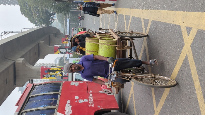 - "A man in a purple shirt and gray beanie rides a bicycle rickshaw with passengers and green barrels along a city street" by FM-9iqtw2, licensed under CC BY 4.0