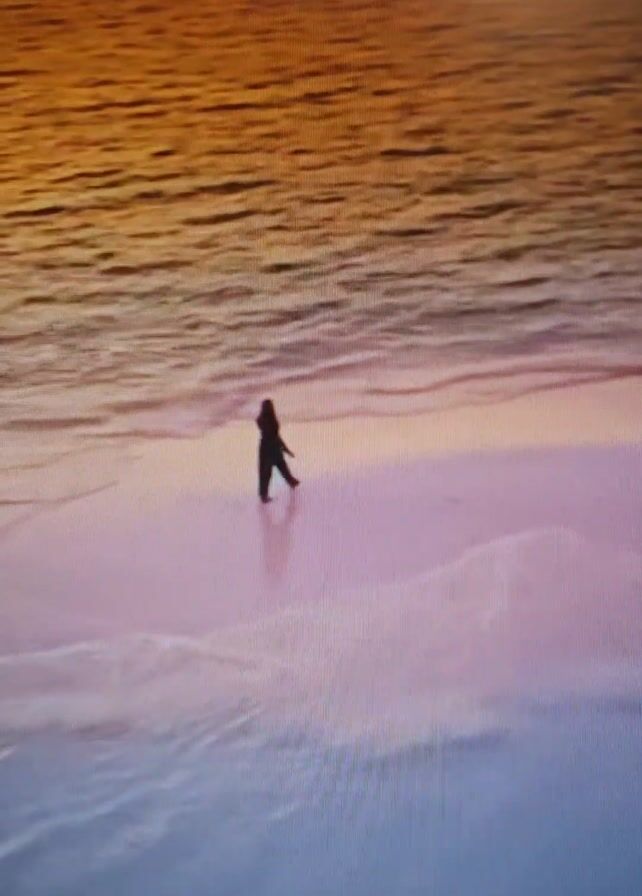 A person is walking on a beach. The ocean is in the background. The horizon is orange, and the beach is a gradient of pink and blue.
