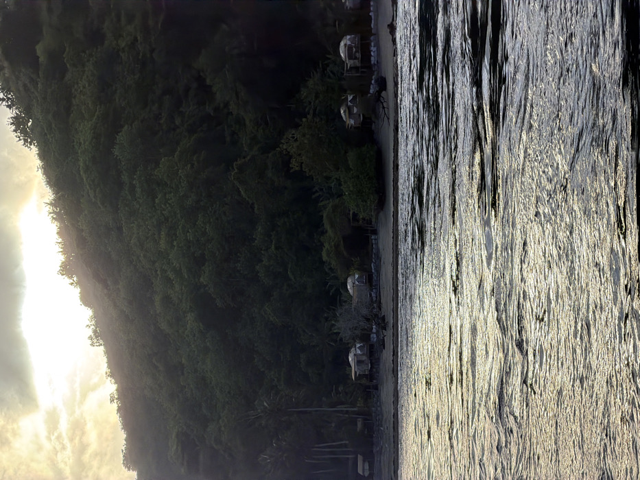 A body of water, shimmering with reflected sunlight, fills the right half of the image. On the left, a densely forested hill slopes downward to meet a narrow strip of beach. Small structures, possibly huts or buildings, are spaced along the beach at the edge of the forest. The sun is obscured by clouds, casting a soft glow on the scene. The perspective is tilted, giving a somewhat disorienting view.