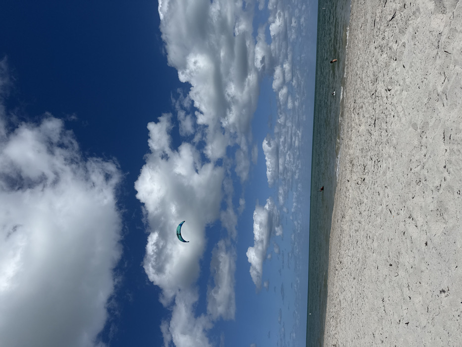 This image depicts a beach and ocean scene on a sunny day in Key Biscayne, United States. The foreground shows light-colored sand with scattered dark debris. The middle ground features calm, teal-green ocean water with a slight ripple. Three individuals are visible in the water; one person's upper torso and head are discernible near the right shoreline, another person is further out on the left, partially submerged or on a board, and a third, smaller dark form is between them. A white marker buoy is visible on the left side of the water, near the horizon. High in the deep blue sky, which is filled with numerous white cumulus clouds, a teal and dark blue kitesurfing kite is prominently displayed, positioned above and to the left of the ocean.