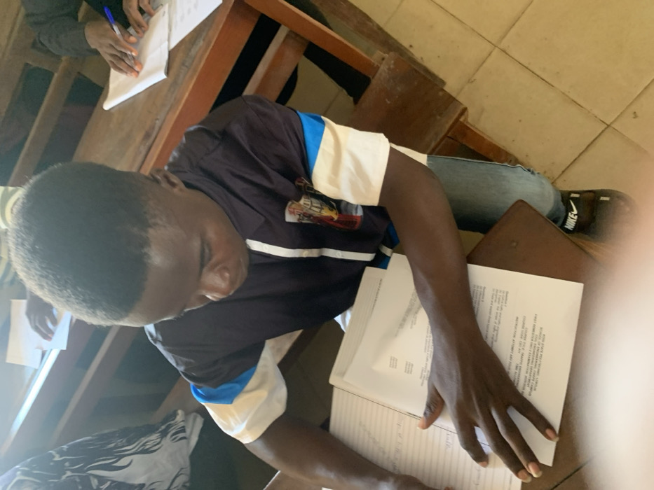 A young dark-skinned male with short dark hair is seated at a wooden desk in what appears to be an educational setting in Abobo, Nigeria