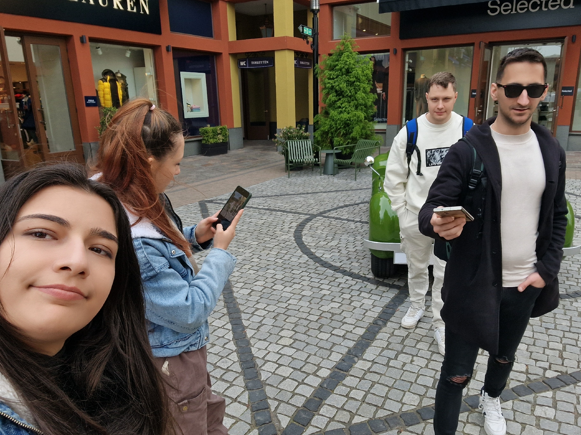 The image depicts four individuals in a commercial outdoor area identified as Wertheim Village Outlet in Wertheim, Germany. The ground is paved with light grey cobblestones, interspersed with darker grey and black cobblestones forming decorative patterns. Retail shopfronts with large glass windows and facades in shades of orange, brown, and yellow line the background. Visible brand signage includes "RALPH LAUREN" and "Selected." From left to right: 1. A young female with long, dark hair is positioned in the foreground, taking a selfie. She looks directly at the camera with a slight smile and wears a light blue denim jacket over a dark garment. 2. Behind and to the right of the first female, another young female with reddish-brown hair, tied in a high ponytail, is engrossed in a black smartphone held with both hands. She wears a light blue denim jacket with a white fleece collar and brown cargo-style pants. 3. Behind the second female, a young male with short brown hair stands with his hands in his pockets. He wears a cream-colored long-sleeve top with a dark graphic print and a blue backpack. He looks forward, slightly to the left of the frame. 4. In the foreground on the right, a young male with dark hair wears sunglasses, a black overcoat, a cream-colored sweater, black ripped jeans, and white sneakers. He holds a light-colored smartphone in his right hand, with his left hand in his pocket. He looks slightly towards the camera. In the mid-ground, a black street lamp post features a small green directional sign pointing towards "WC TOILETTEN." A small, conical green evergreen tree stands nearby, flanked by two modern green metal chairs and a small matching table. A portion of a bright green compact vehicle or display item is partially visible behind the two males. Mannequins displaying clothing are visible inside the shop windows. The overall lighting is consistent with daytime.
