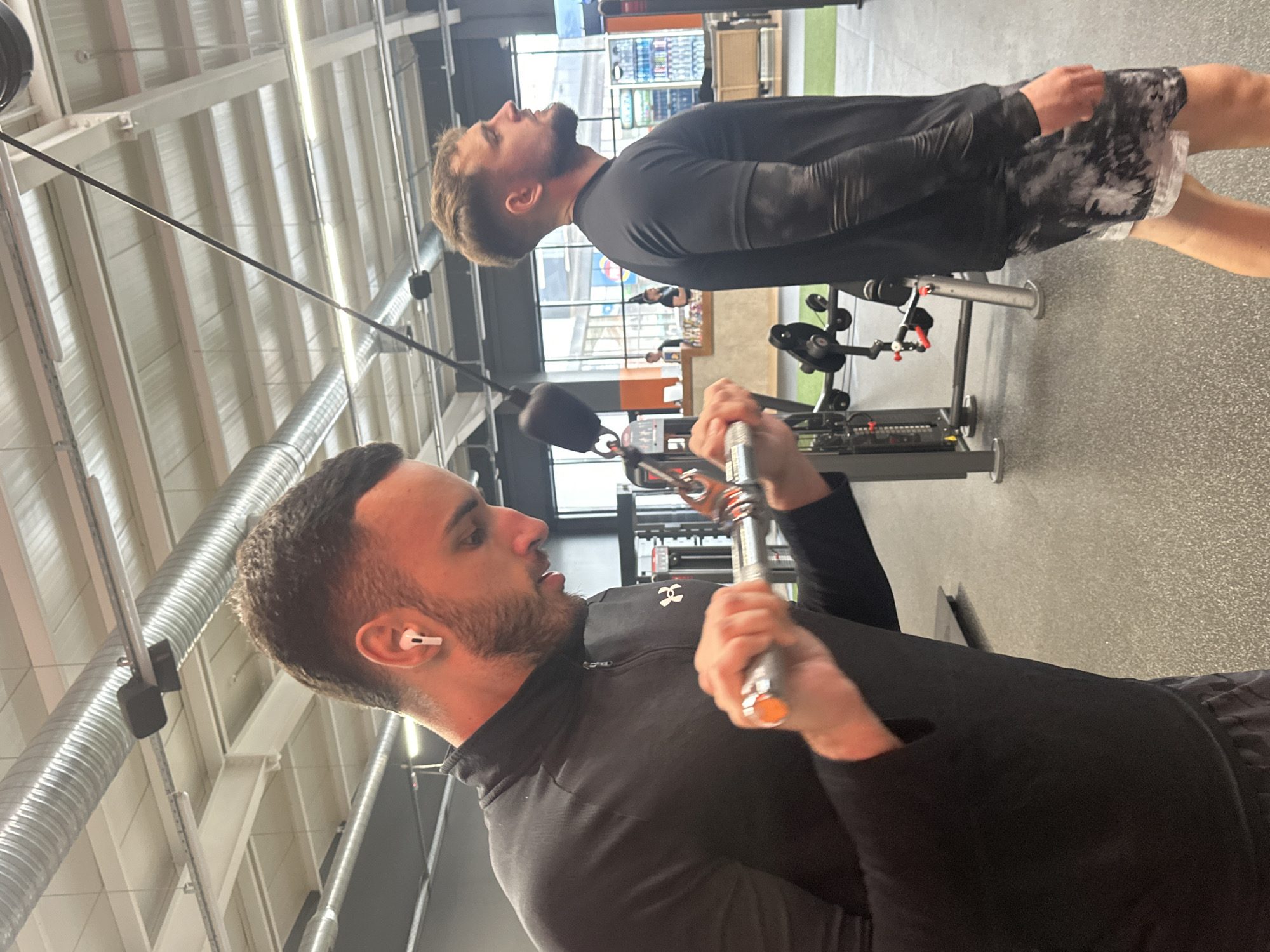 The image depicts two men in what appears to be a modern fitness center. The gym features a grey floor, white-painted ceiling structures with visible ventilation ducts, and several weight training machines in the background. One man, closer to the camera, is in the foreground, and appears to be engaging in a cable lat pulldown exercise. He is wearing a black long-sleeved athletic shirt and what looks like earbuds. The second man is further back in the frame, standing with his head tilted upward. He is also dressed in athletic apparel: a black long-sleeved shirt and patterned shorts. The location, Plovdiv, Bulgaria is not identifiable from the given scene.