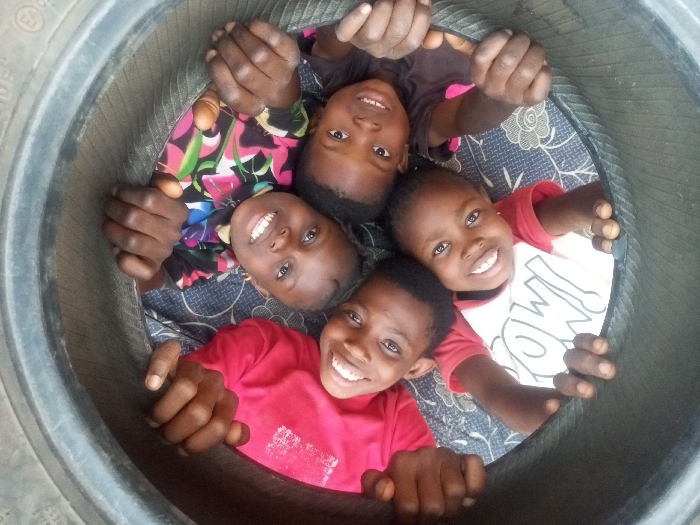 Five smiling children are arranged in a circle inside a large, black tire. They appear to be looking directly at the camera. Each child has dark skin and short hair. They are wearing colorful tops including red, black, white, and a bright floral print. The tire frames their faces and hands, and a patterned surface can be seen inside the tire around them.