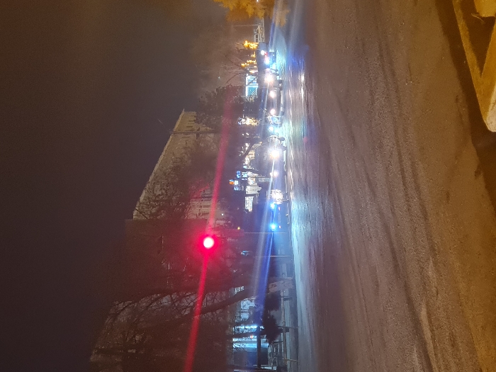 This image depicts a nighttime street scene at an intersection in Qorowul, Uzbekistan. A prominent red circular traffic light, positioned centrally on the left, is illuminated, indicating a stop. Multiple vehicles, primarily passenger cars, are visible across the width of the frame, their headlights, predominantly bright blue and white, casting strong light and lens flares on the asphalt road surface. The road shows signs of tire marks and minor irregularities, illuminated by warm orange street lighting, particularly in the foreground. In the background, behind a line of bare-branched trees, several multi-story buildings with visible windows or illuminated facades line the street. The sky above is dark and cloudless. No individuals are explicitly visible. The scene captures an active urban thoroughfare under artificial illumination.