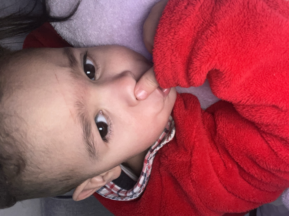 A baby, dressed in a soft red onesie with a checkered collar, gazes directly at the viewer. The infant is lying on their back on a light purple surface, with a white towel nearby. The baby's dark eyes and delicate features are prominent, and a finger is near their mouth, seemingly being chewed on. The baby's hair is short and dark, and there appears to be a scratch on their forehead.