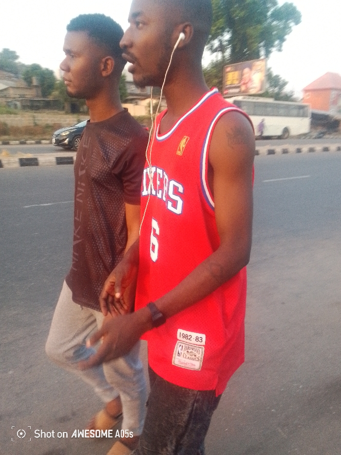 Two men walk side-by-side on a road. The man on the right wears a red "Sixers 6" basketball jersey and a smartwatch. He has an earbud in his ear. The man on the left wears a dark patterned shirt and light grey sweatpants. A car, bus, and billboard are visible in the background. The photo was taken with a phone that has the watermark "Shot on AWESOME A05s".