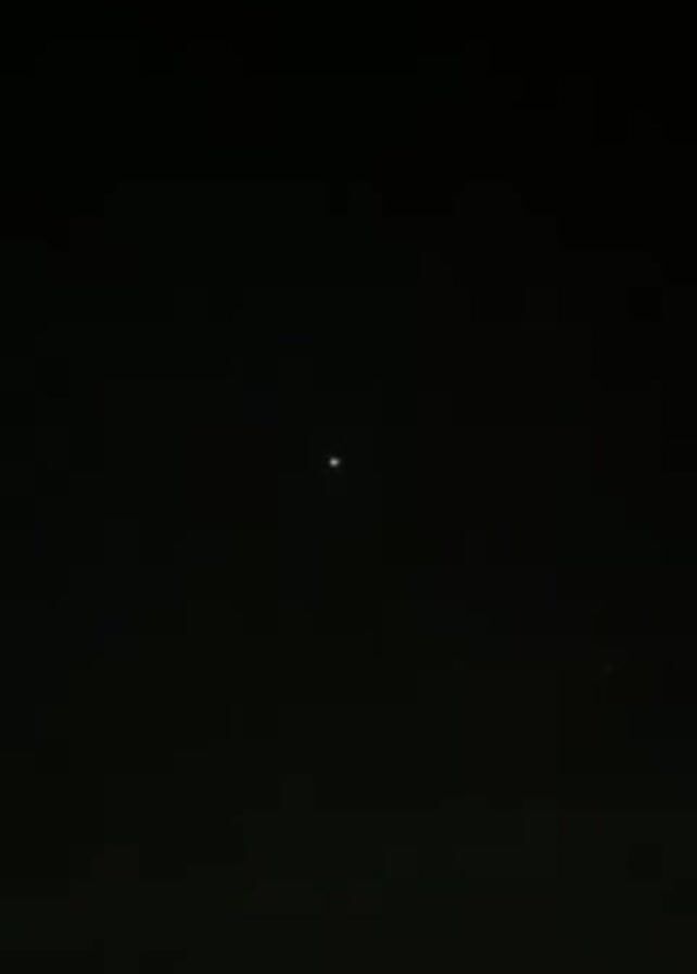 dark night sky. A single bright point of light, possibly a star or planet, is visible in the center of the frame. Another much fainter point of light appears lower and to the right. The camera is held still.