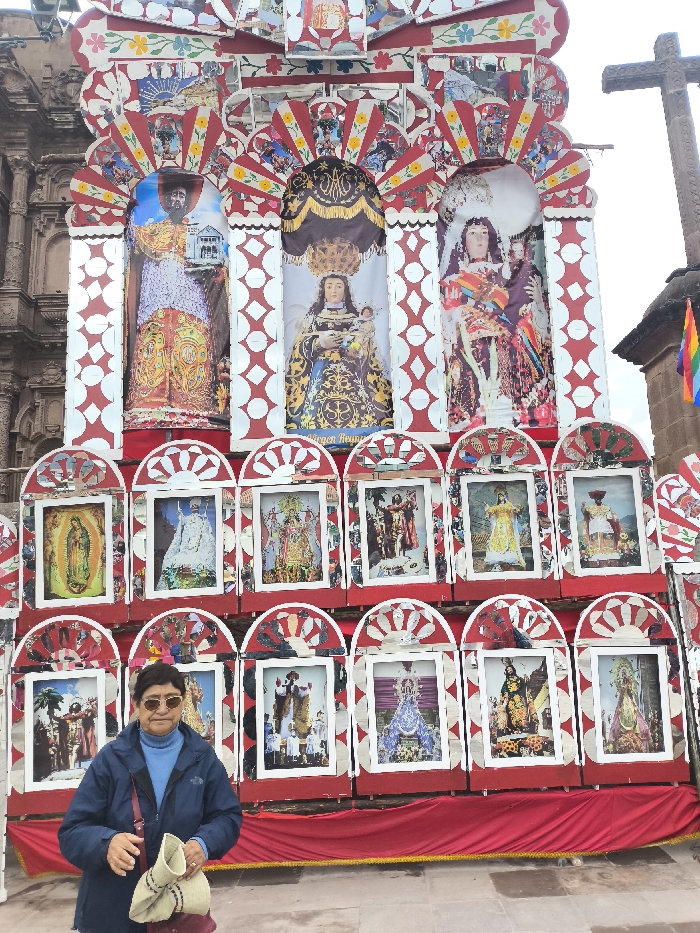 A woman stands in front of a religious display. The large structure is adorned with multiple images of religious figures, including a man holding a building, a Madonna and child, and a woman in ornate clothing. The display features a red and white color scheme, incorporating semi-circular arches and numerous smaller framed images. A rainbow flag and cross are visible in the background, hinting at the location's cultural or religious significance.