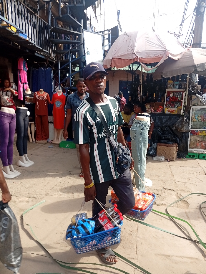 A man in a striped shirt and cap carries two blue baskets filled with soda bottles and snacks, suspended by ropes. He stands in a bustling outdoor market with mannequins displaying clothes nearby. Overhead, umbrellas and awnings provide shade. Other people are visible in the background. The scene suggests a street vendor offering refreshments in a crowded area.