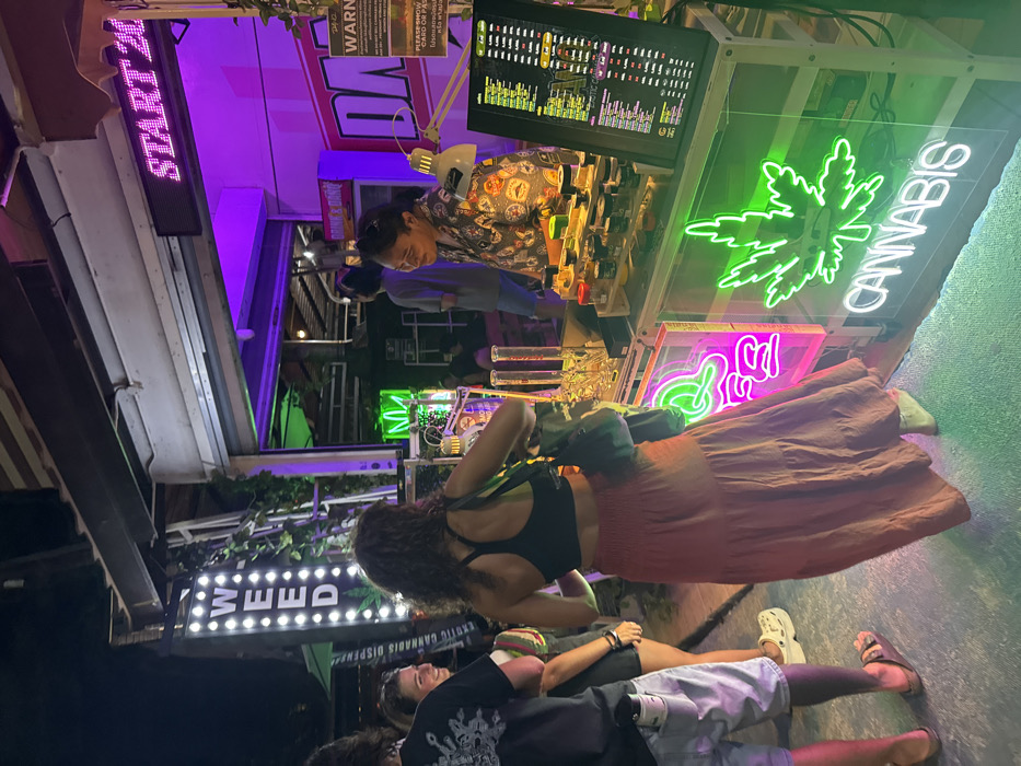 The image displays a nighttime scene at an outdoor cannabis dispensary on a street in Ban Ko Li Pe, Thailand