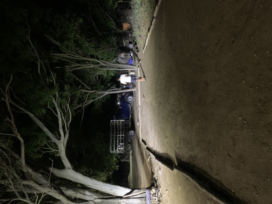 A nighttime scene reveals a dark road beside a leafy area with bare-branched trees. A blue pickup truck with a caged back sits alongside the road where two individuals stand. One figure, wearing a white shirt and shorts, faces the road. Another person in a blue shirt stands near a building in the background. The environment appears dimly lit, highlighting the figures and the vehicle against the darkness.