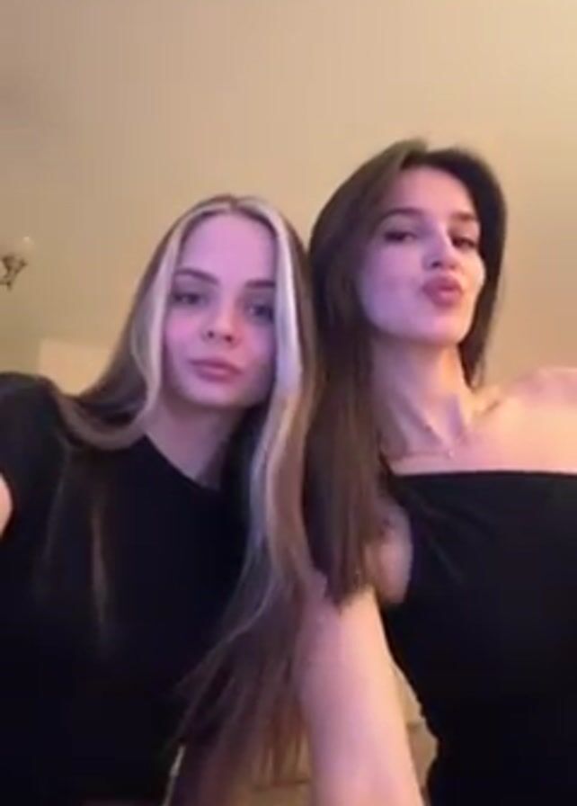 Two young women stand close to one another indoors. They are both wearing black tops. The woman on the left has long brown hair with a blonde streak near her face. The woman on the right has long dark brown hair and wears a thin necklace. Both women puck their lips and blow kisses to the camera.
