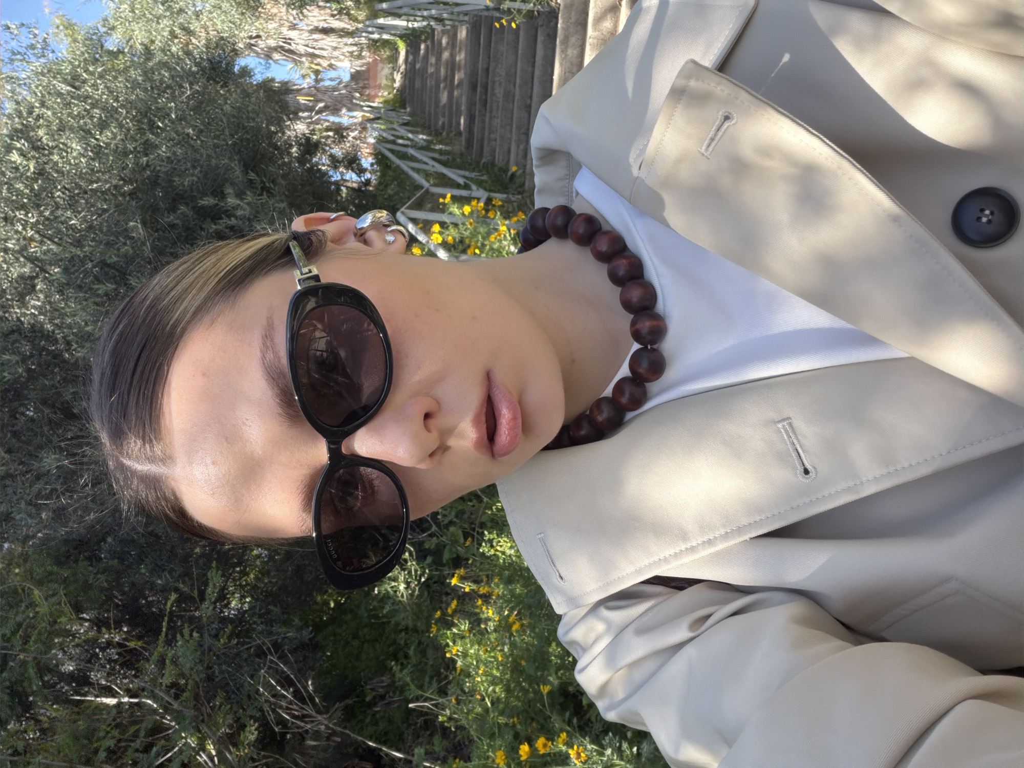 A woman is photographed outdoors in daylight, appearing to be on a path or trail. She is wearing a light-colored trench coat over a white top and a dark wooden beaded necklace. Dark sunglasses with the brand Gucci are perched on her face, and she sports multiple earrings. The background includes green foliage, small yellow flowers, a set of stone steps, and the sky. The photograph is taken from a low angle and seems to be rotated. The setting appears to be a green space within Tel-Aviv, Israel, given the Mediterranean vegetation and architectural elements typical of the city.