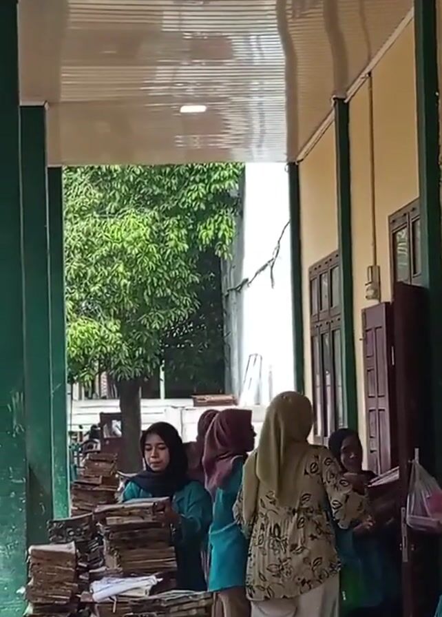 group of young women standing on a covered porch. All the women are wearing hijabs and are dressed in clothing that includes a light green color. They are standing around tables covered in what appears to be stacks of books or papers. Some of the women are picking up items, possibly distributing materials or taking them away. The porch has green support beams and a white ceiling. Behind the women, there is a view of a lush green tree and a building with a crack in the wall. The overall scene suggests an educational or administrative environment.