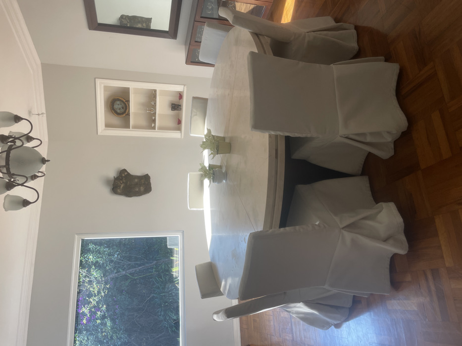 A dining room features a round marble table surrounded by upholstered chairs with fabric covers