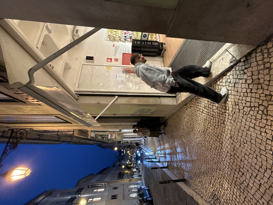 The image depicts an urban street scene at twilight or early night in Lisbon, Portugal, characterized by wet cobblestone sidewalks and illuminated buildings. A male subject, bearded and dressed in a grey hooded sweatshirt and dark trousers, is captured mid-stride exiting a commercial establishment on the right, identifiable by a partially visible "Tiger" sign on its awning. His left foot is on the wet, light-colored cobblestone sidewalk, while his right foot remains on the store's threshold. The store interior is brightly lit, displaying merchandise, including colorful small items. To the mid-ground left, two female subjects stand conversing on the sidewalk, one in a light top and long skirt holding an object, alongside another in a dark jacket. The wet street, lined with black bollards, extends into the background where multi-story buildings with balconies and illuminated, ornate streetlights are visible. Approaching vehicle headlights are present in the distance. A "Starbucks Coffee" sign is visible further down the street on the left, and a "P&B" sign on a building on the right.