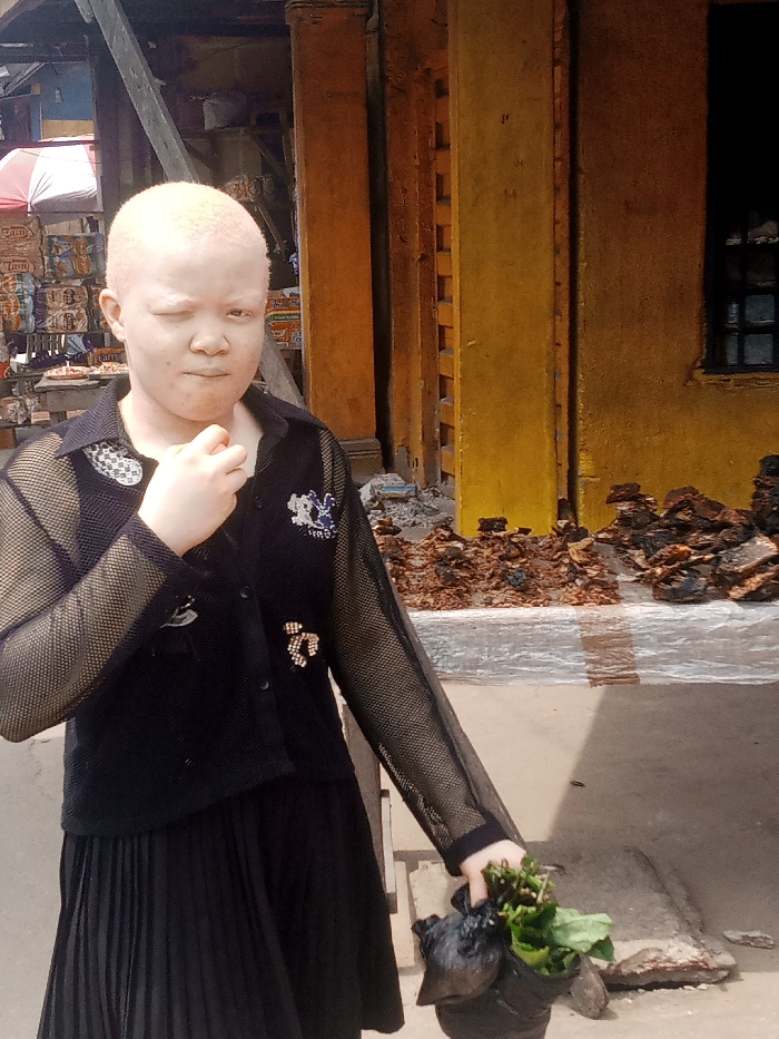 An individual with albinism stands facing forward outdoors in Umuode, Nigeria
