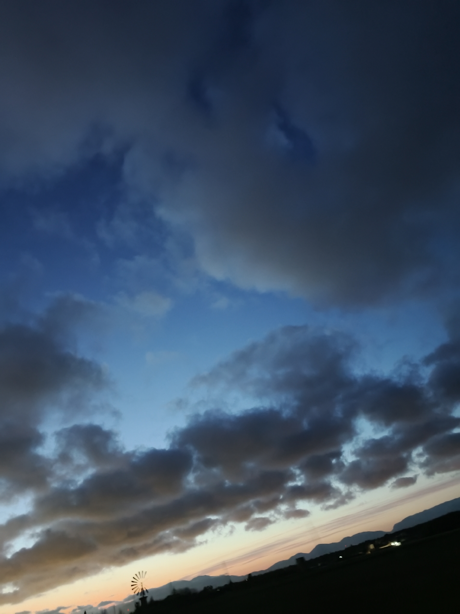 The scene depicts a twilight landscape, likely at sunset, in the rural vicinity of Palma de Mallorca, Spain. The upper two-thirds of the image display a sky gradient transitioning from dark blue at the zenith to lighter blue, then to hues of orange and pink at the horizon. Scattered dark grey cumulus clouds are prevalent across the sky. The lower third of the image features a dark, silhouetted landmass, presenting a distant mountain range against the colorful horizon. Prominently positioned in the lower-left quadrant of this silhouette is a traditional windmill, identifiable by its multi-bladed fan structure. Small, diffused artificial lights are visible in the mid-ground, indicative of distant human habitation or infrastructure. No human subjects, animals, or specific actions are present.