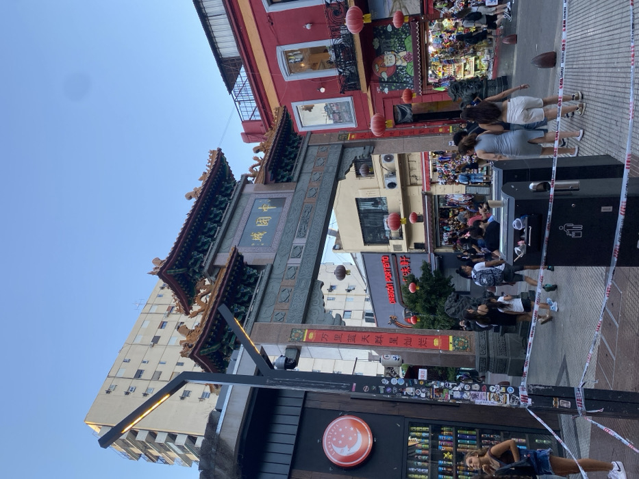 A vibrant street scene features a traditional Chinese gate with intricate detailing and Chinese characters