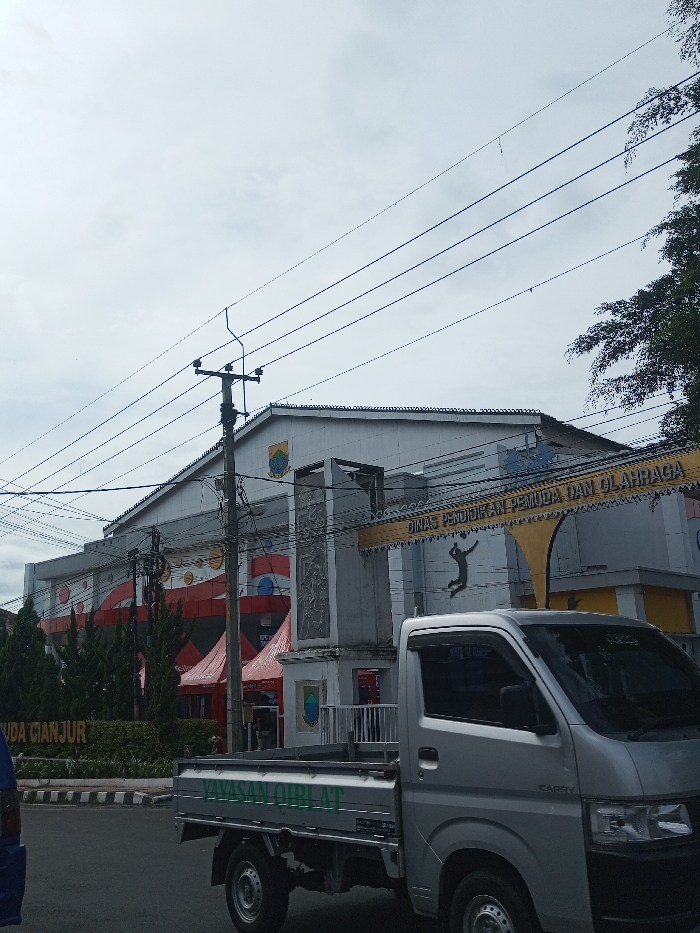 A silver pickup truck with “CARRY” printed on the side parks on a street. A building with a gable roof stands behind it. An overhead banner reading “DINAS PENDIDIKAN PEMUDA DAN OLAHRAGA" hangs above the entrance, featuring a silhouette of a volleyball player. Utility poles and power lines crisscross the sky above the building. Tents are visible on the left, along with some green shrubbery. A partially visible blue vehicle is present in the lower left corner.