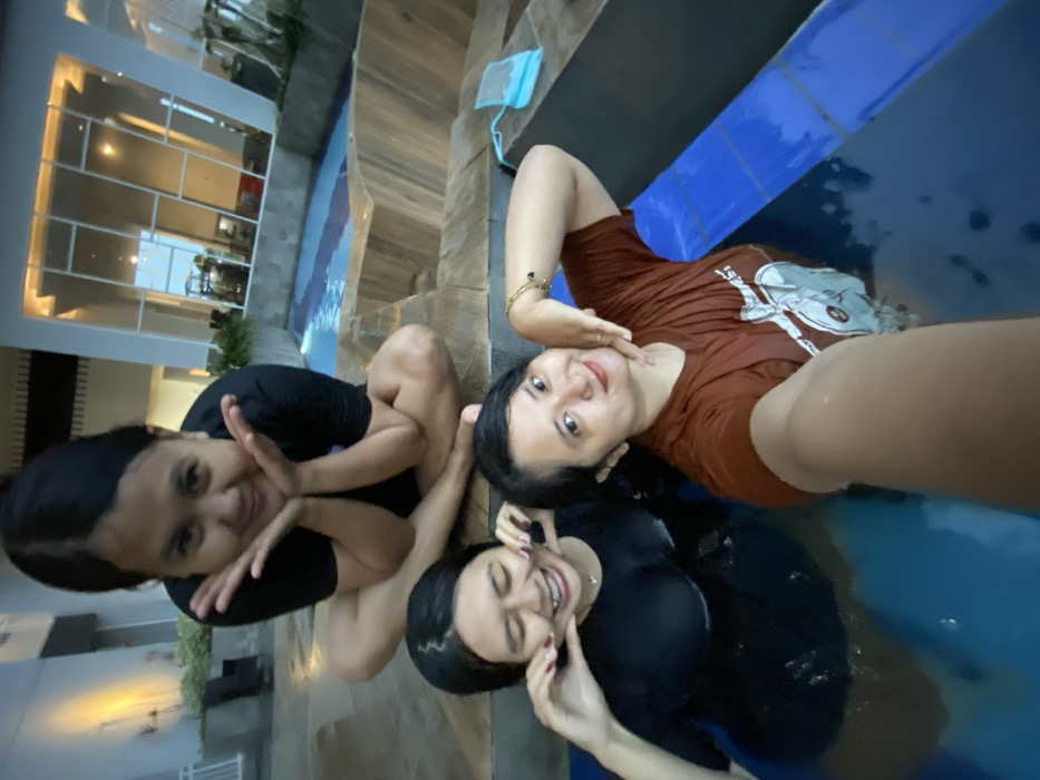 Three adult females are depicted in a recreational aquatic setting, likely a hotel pool area, in Sidoarjo, Indonesia